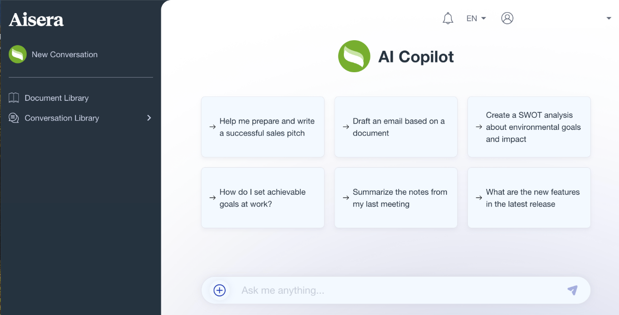 The Aisera Assistant/Copilot gives you an end-user experience similar to ChatGPT.&#x20;