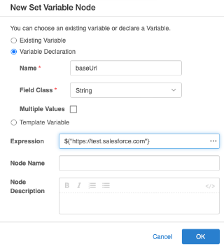 Values that are used often within the workflow should be included as a separate workflow variable and should be initialized at the beginning of the workflow. Use the pre-built Set Variable node in this case.