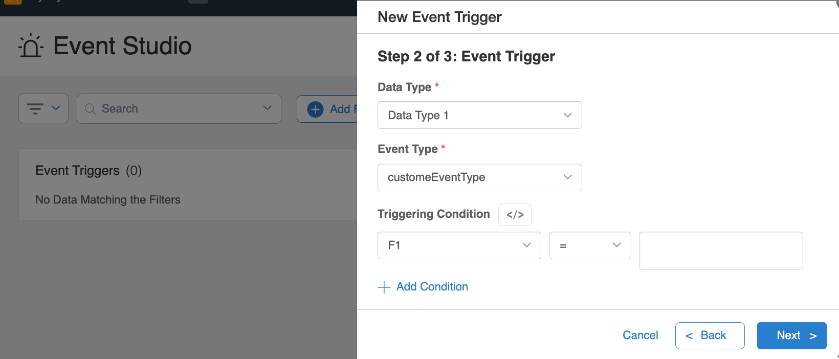 3. Associate your **Data Type**, **Event Type**, and **Triggering Condition**. <br>