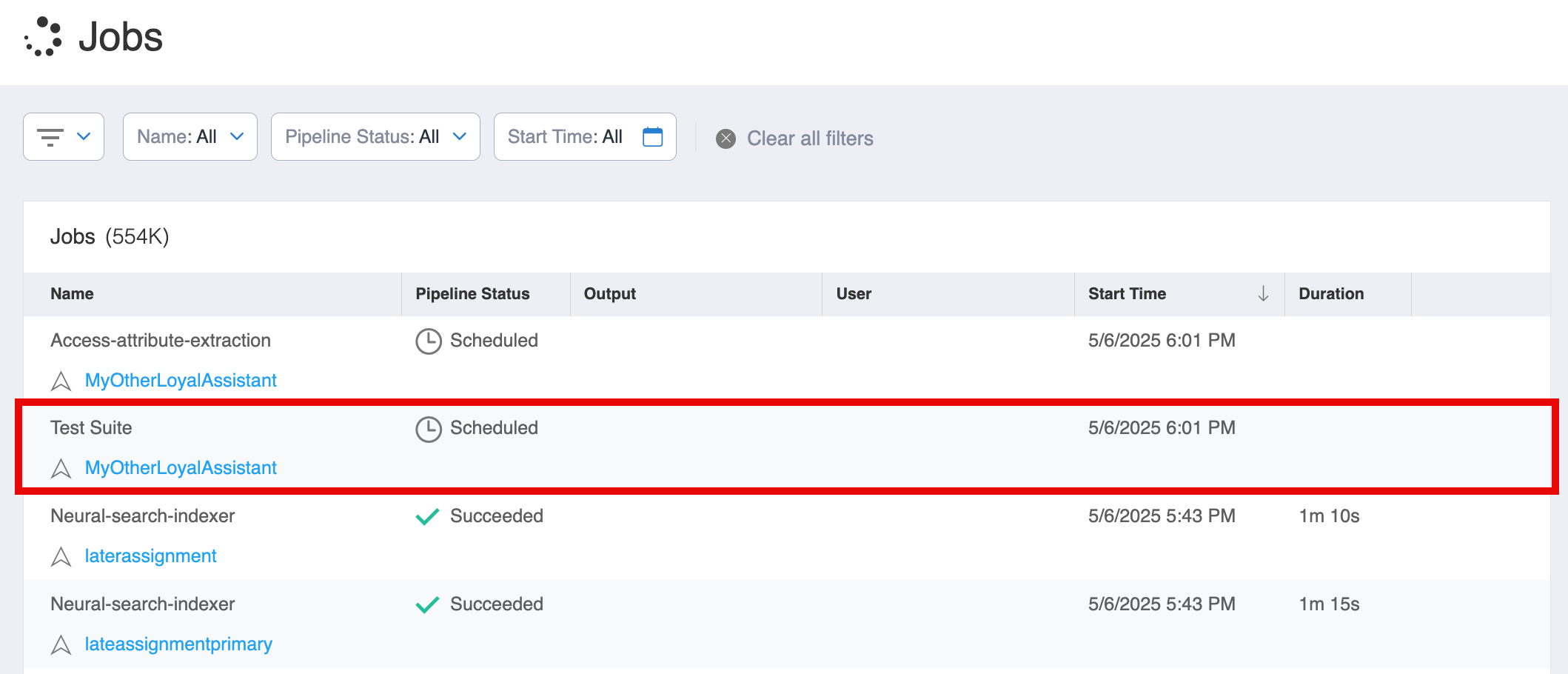 Click on the View Jobs twirling icon to see the status of your Test Suite. In the diagram below, you can see that the Test Suite is in the Scheduled status. You can also get to this page using the Settings > Jobs command in the Aisera Admin UI.