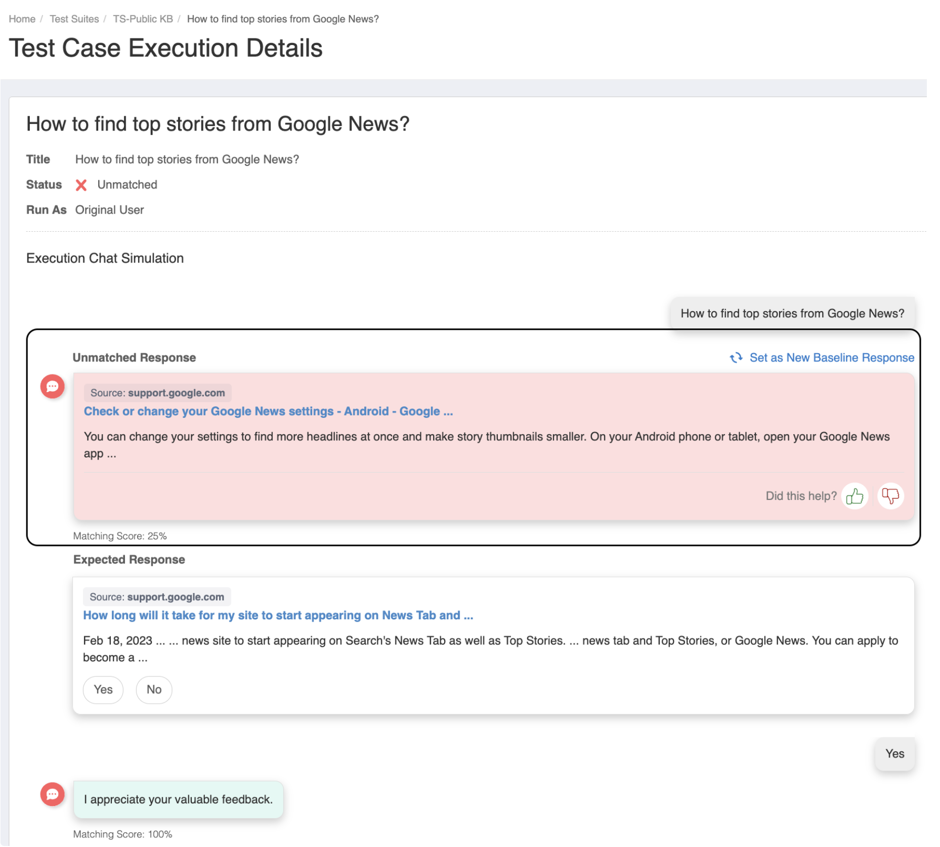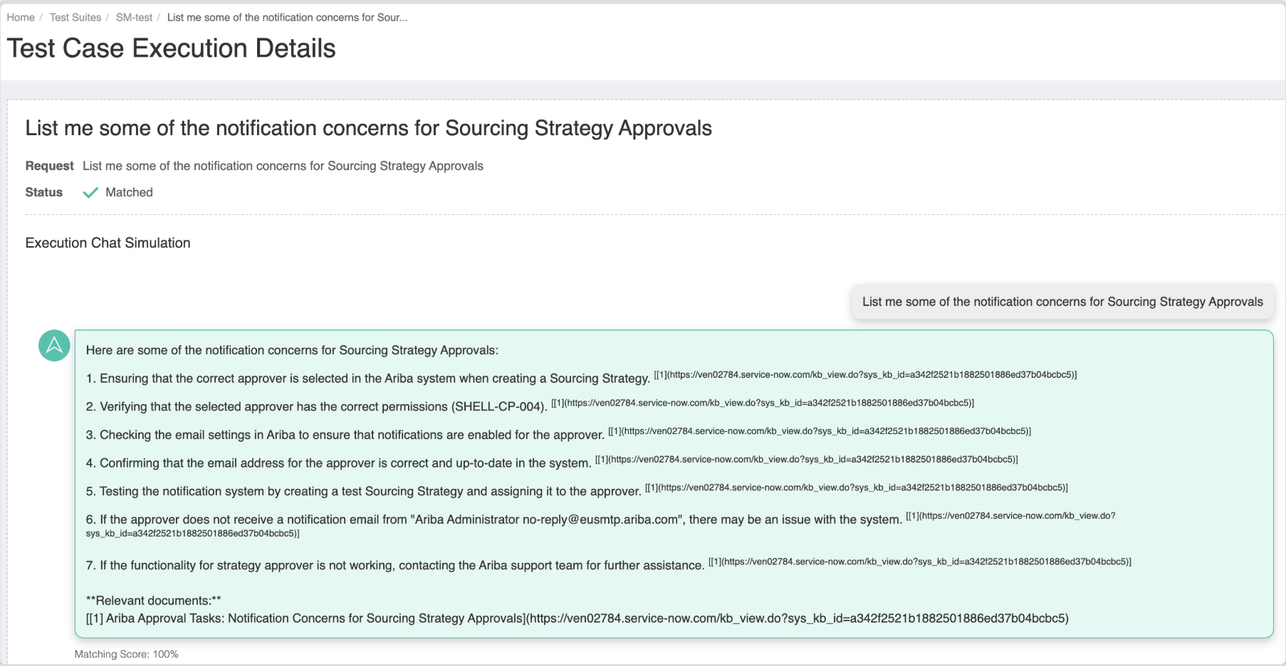 For test cases that are Matched, the Execution Chat Simulation will indicate that the historical conversation matches (contextually or syntactically) the original conversation replayed during the test suite execution, with a Matching Score.