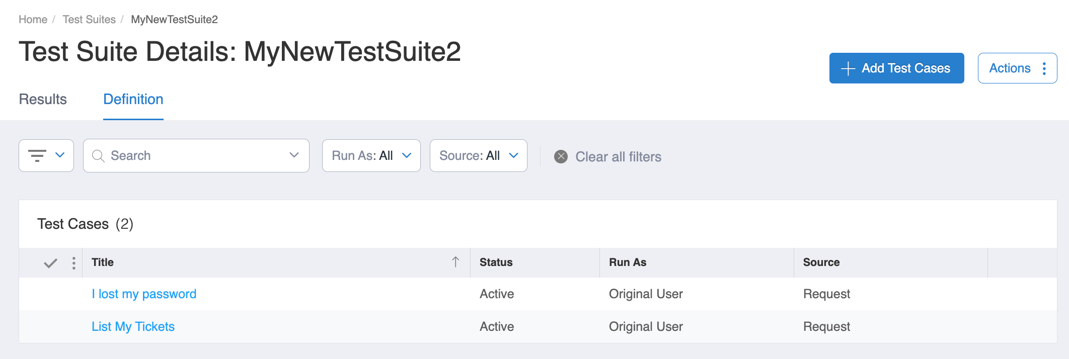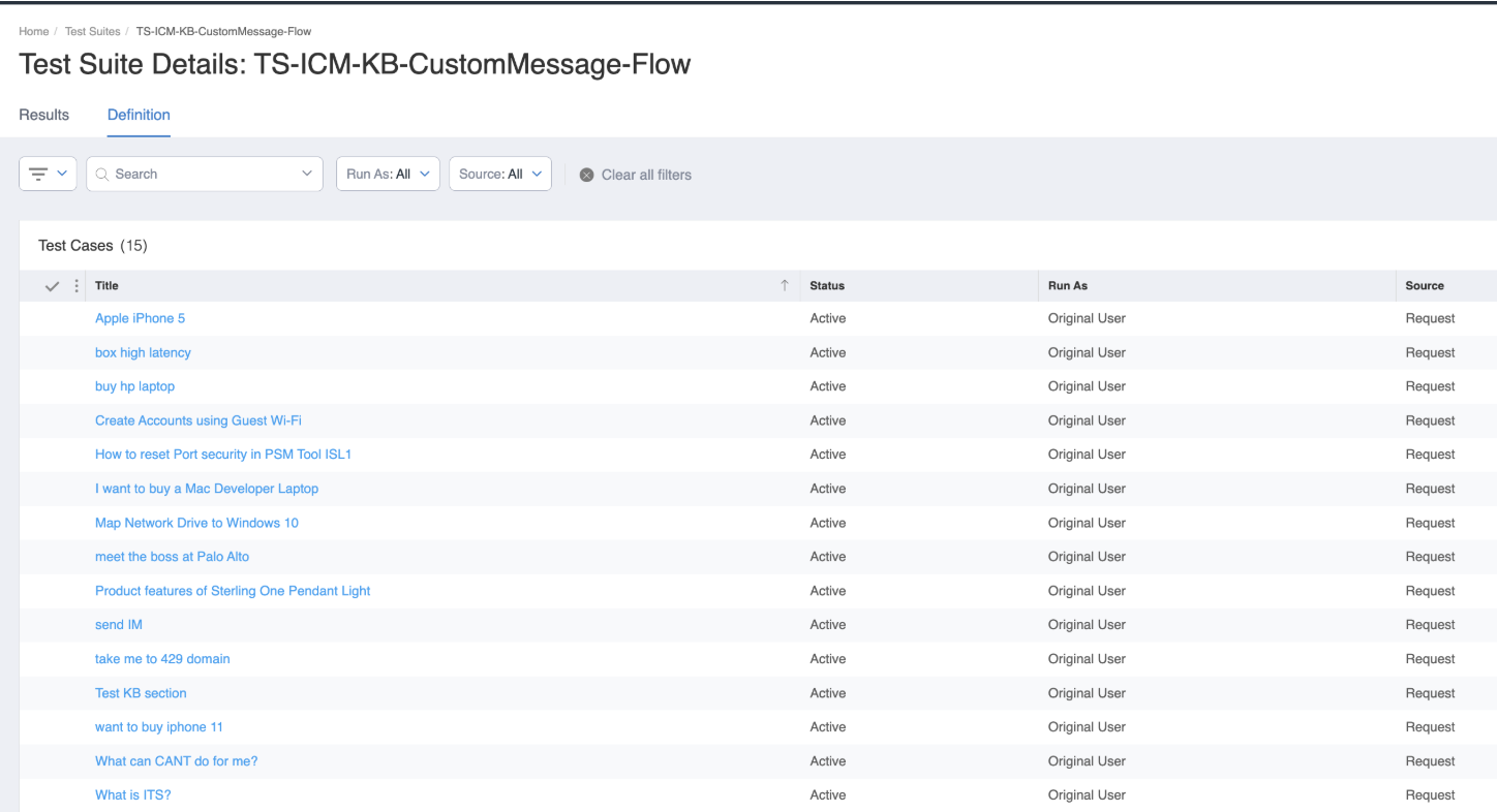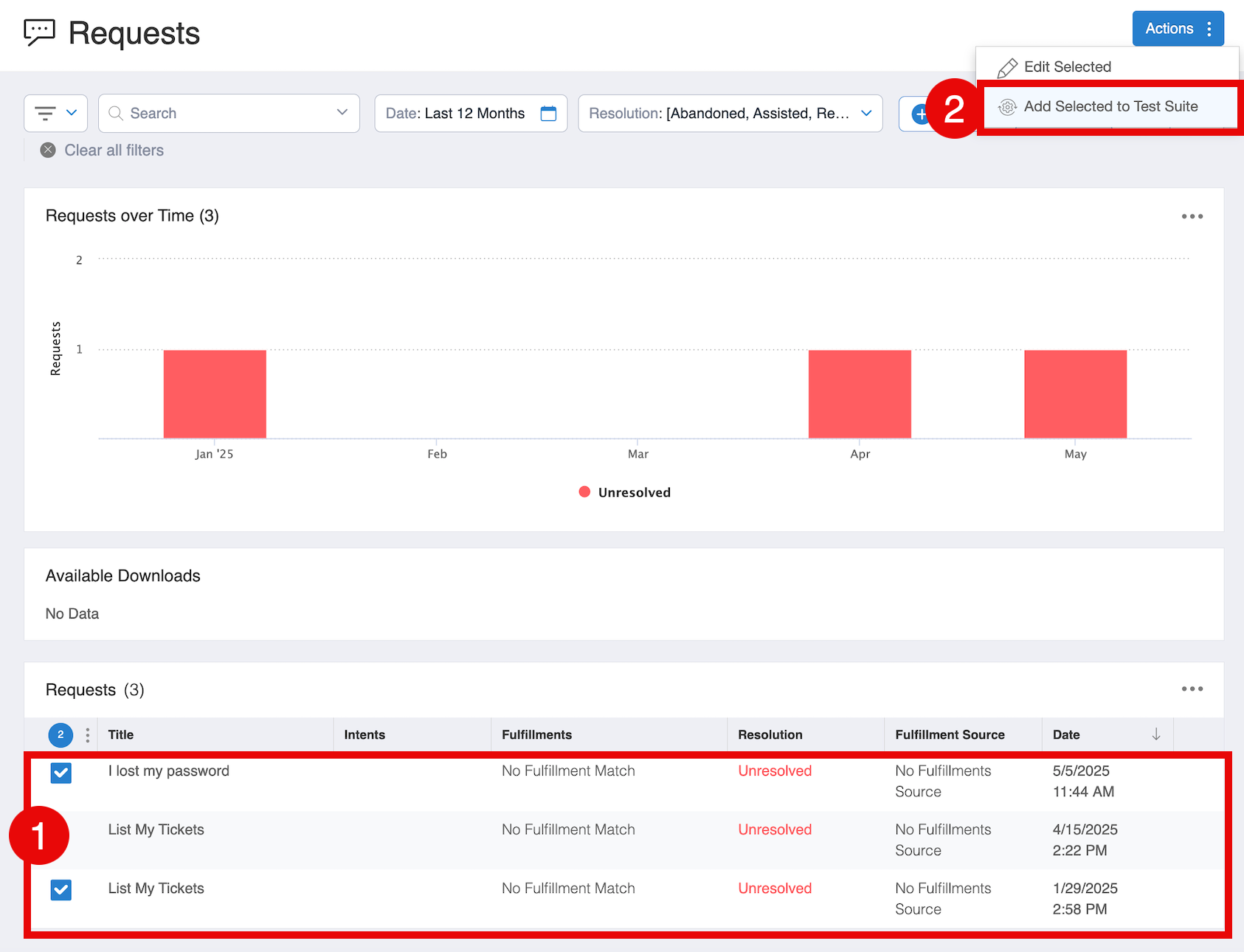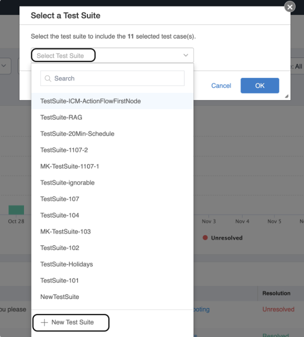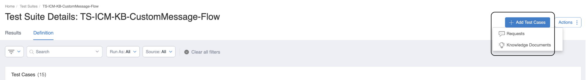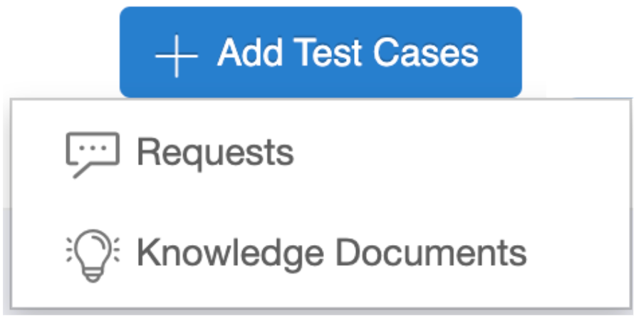 Test Case Creation - You can create a Test Suite using either Requests or Knowledge Base Articles (Knowledge Documents).