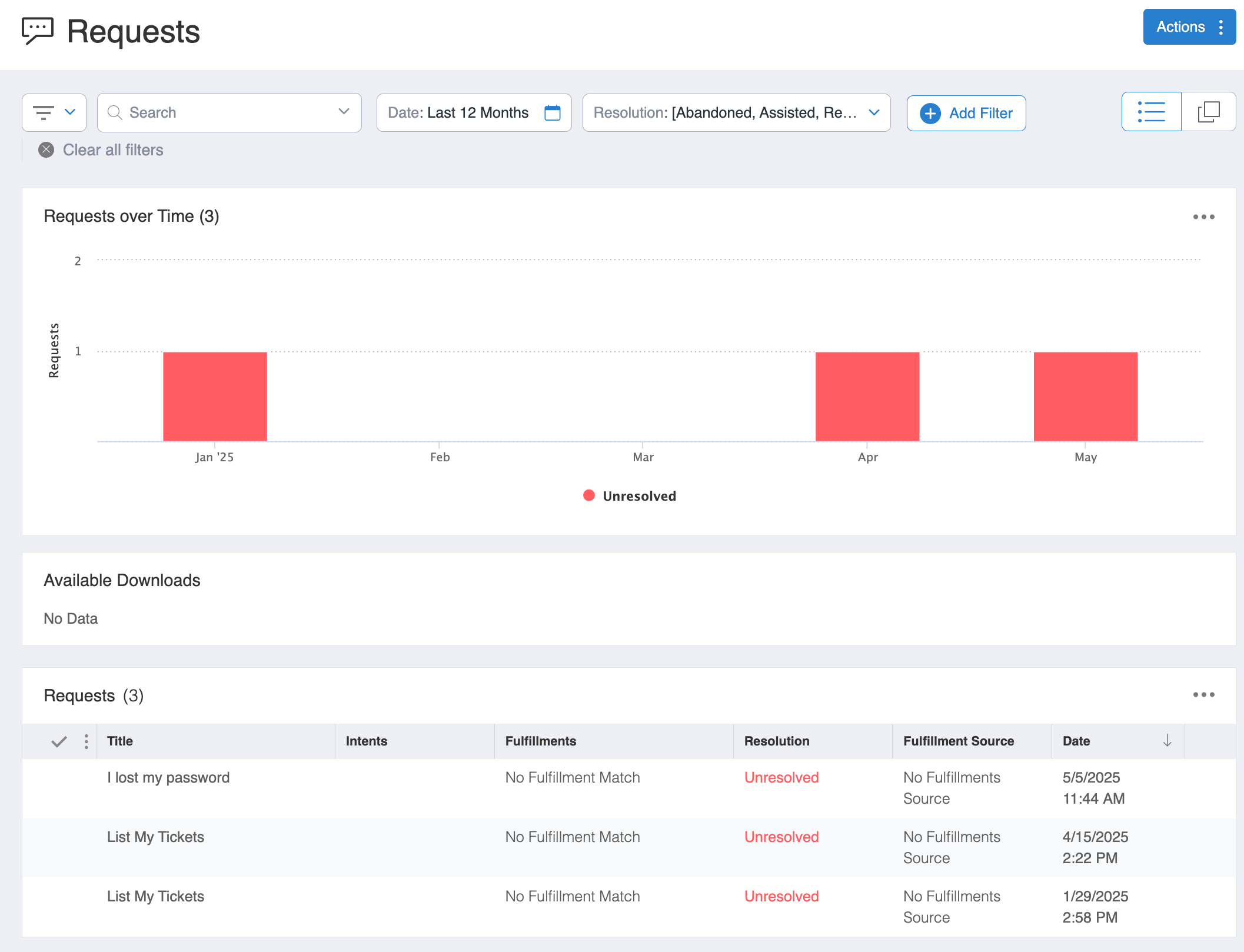 Request → Test Case - You can generate a test case from a conversation request between a user and a chatbot. This is a sequence of Requests and Responses with a Resolution (Fulfillment) provided by the chatbot with a status of Resolved, Unresolved, or any other Resolution Status.