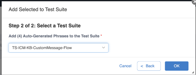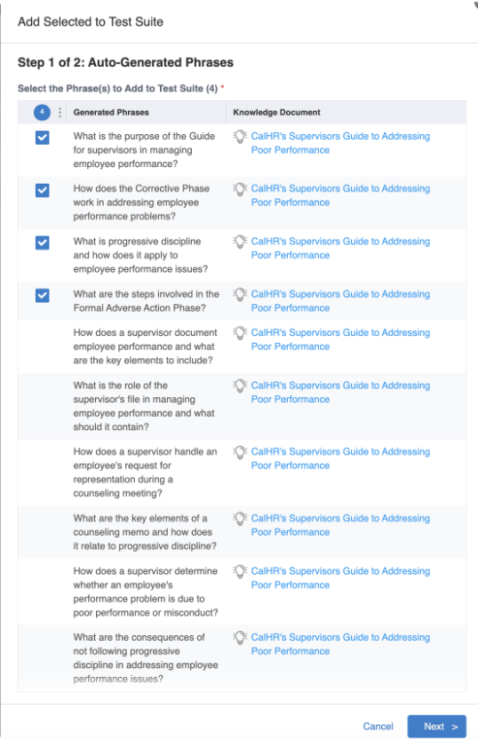 Choose Knowledge Documents that you wish to generate phrases from for testing and add those phrases as Test Cases for the Test Suite.