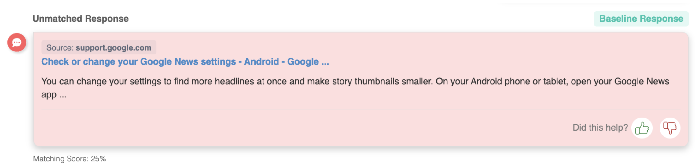 Unmatched: The bot’s response has deviated from historical behavior, flagging a potential regression.