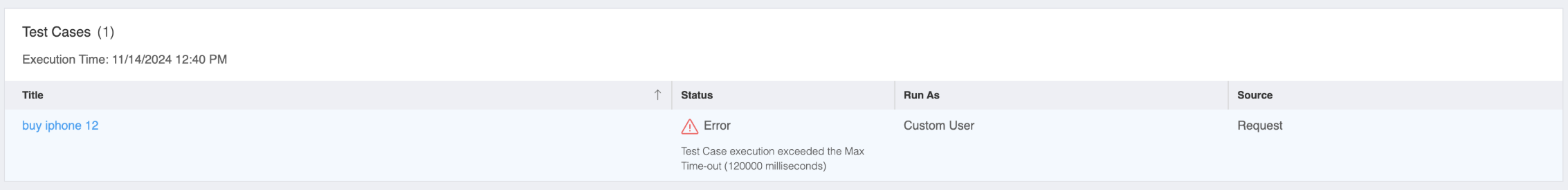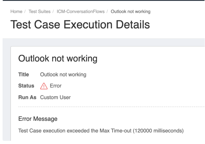 NOTE: Whenever a Test Suite execution exceeds 10 minutes, the test case times out, triggering an error message displayed on the UI (as shown in the screenshot below).
