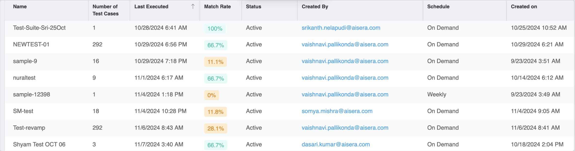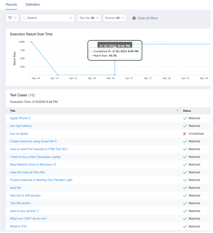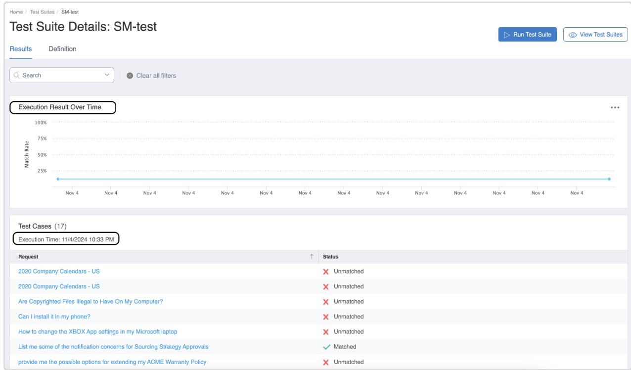 Execution Results Over Time - Displays the Match Rates of all Test Suite executions over time, visualized in a timeline plot (see screenshot below). Execution time varies based on the number of test cases in a suite. After execution, each Test Case's status will automatically update, indicating whether it matched or did not match with the historical conversation.