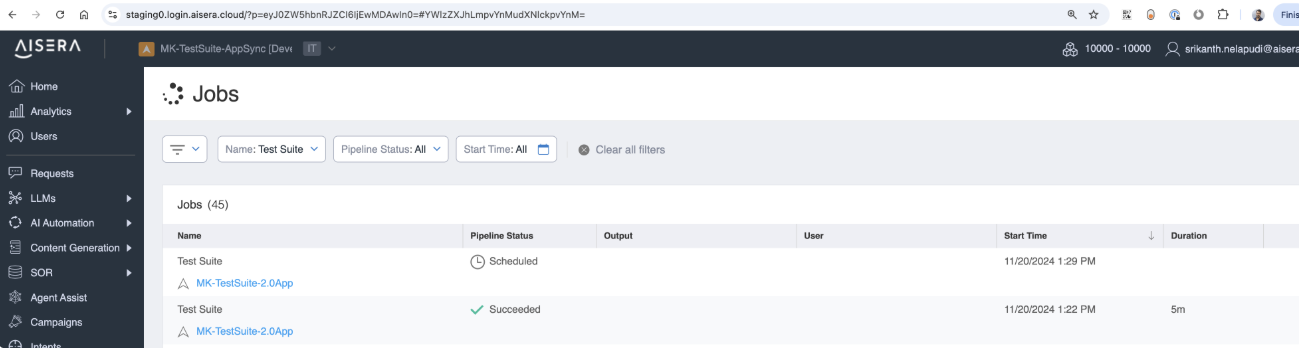 Last Executed Time - Records the timestamp of the most recent Test Suite run (see screenshot below). Note that you can track status of the Test Suite executions in the Aisera Admin UI by navigating to Settings > Jobs as shown below: