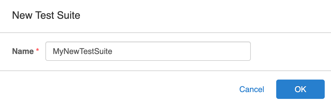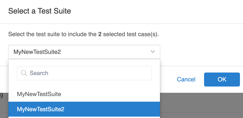 You can add the selected Test Cases to an existing Test Suite or create a new Test Suite. When adding to a new test suite, user is required to enter a unique Test Suite Name: