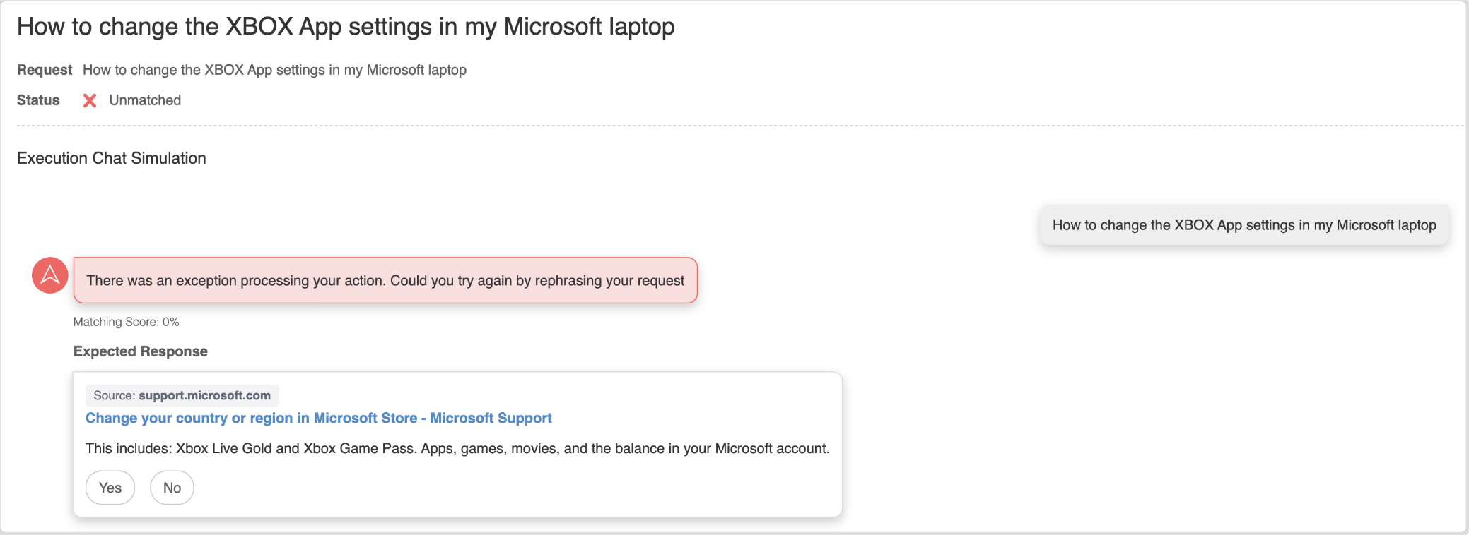 For test cases that are Unmatched, the Execution Chat Simulation will indicate that there was a difference in the bot’s response when it was replayed during the test compared to the historical conversation along with a corresponding low matching score: