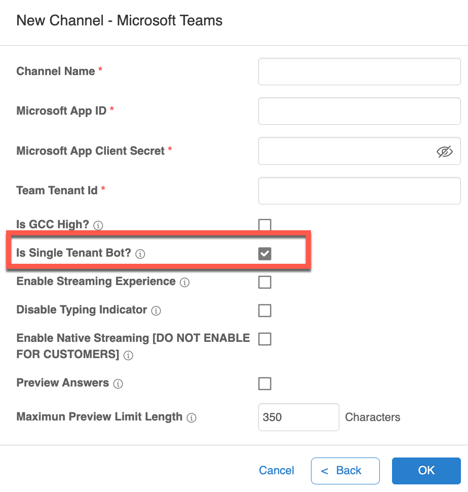 3. IMPORTANT: Select the **Is Single Tenant Bot?** checkbox. MS Teams no longer supports Multi-Tenant Bots.
