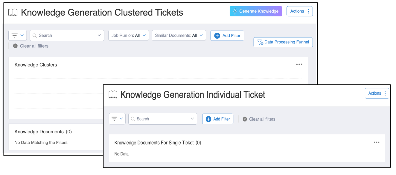 Navigate to Content Generation > Knowledge Generation Clustered Tickets, choose Job Configuration from the Settings pull-down menu and then click the Generate Knowledge button. The results for this option are returned on the Knowledge Generation Clustered Tickets window.