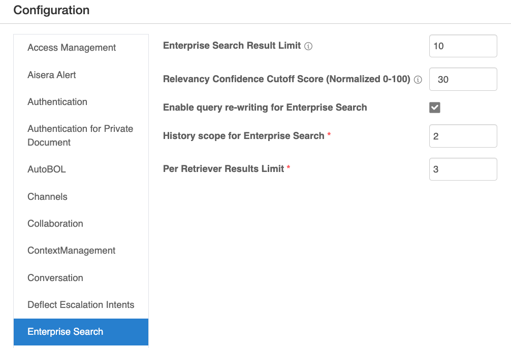 The Settings > Configuration > Enterprise Search window allows you to set parameters for your tenant. These are settings that apply to any bot you create in this Aisera tenant.